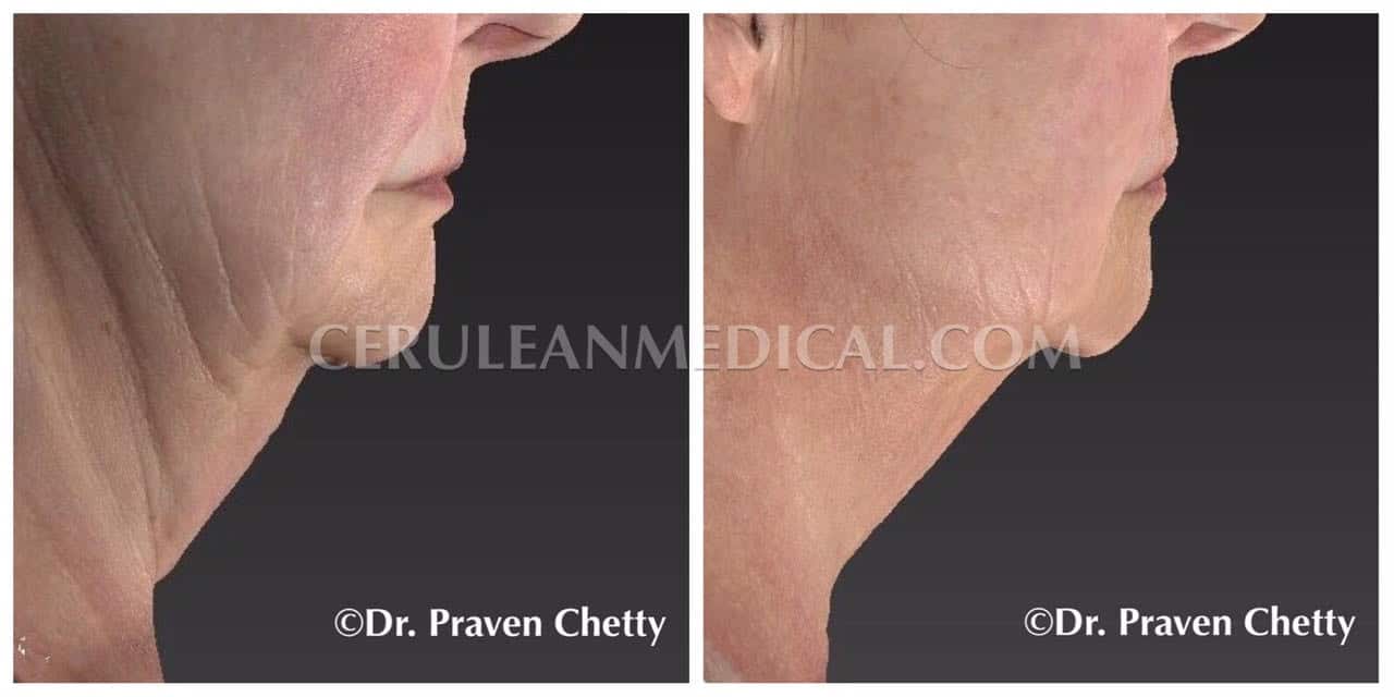 Skin tightening procedure illustrating an enhanced jawline with improved skin texture and tone from collagen neogenesis